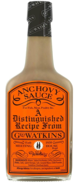 •	Ingredients: Water, Salted Anchovies (34%) [Anchovies (Fish), Salt], Spirit Vinegar, Salt, Ground Mace, Chilli Powder, Stabiliser (Xanthan Gum).